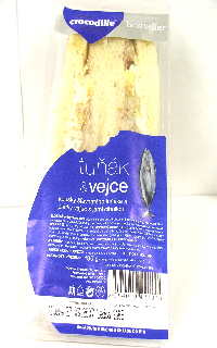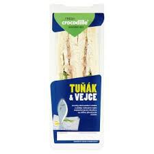 Kousky šťavnatého tuňáka s plátky vařených vajec doplněné jarní cibulkou na bílém pšeničném chlebu.